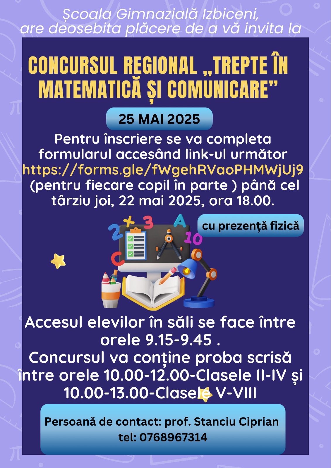 Stimați colegi vă invităm să participați la Concursul Regional „Trepte în matematică și comunicare”, un eveniment dedicat dezvoltării gândirii logice și abilităților de exprimare. Concursul se desfășoară, cu prezență fizică, la Școala Gimnazială Izbiceni, Olt, duminică 25 Mai 2025.